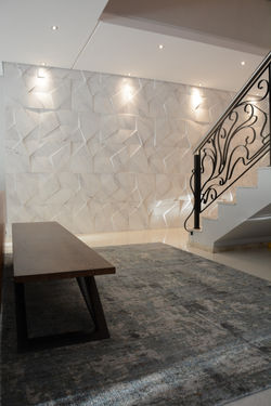 Este hall de entrada sempre foi amplo e iluminado, no entanto estava precisando de uma repaginada, a fim de ficar mais contemporâneo e alegre. Como não havia a intenção (nem a necessidade) de fazer uma grande obra, trabalhamos com a atualização de revestimentos de parede, mobiliários e acessórios de decoração. Os antigos revestimentos de meia parede foram removidos e uma cor mais neutra foi escolhida para a nova pintura. Os móveis clássicos foram substituídos por peças mais modernas, como a poltrona Barcelona e aparador Grammo-Fahrer. Tapete, espelho, luminárias e quadros também foram renovados. Todas as peças foram escolhidas com o objetivo de dar mais leveza, sem perder o conforto que o ambiente pode oferecer. Por fim os proprietários ainda aproveitaram para estender as melhorias um pouco mais pra dentro da casa, aplicando revestimento 3D e compondo com tapete e banco o espaço junto à escada principal, que dá continuidade ao hall social.